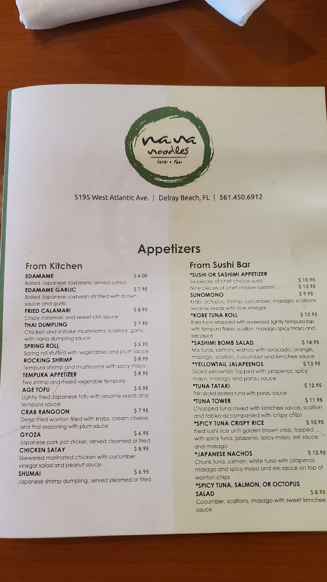 Welcome to Nana Noodles and Sushi Bar, a delightful culinary gem nestled in Delray Beach, FL. Specializing in both Thai and Japanese cuisines, this restaurant offers a menu that is robust and enticing. From the flavorful Thai Basil Stir-Fry to their exceptional sushi offerings—like the fresh White Tuna and Spicy Tuna Hand Rolls—every dish is crafted with care and attention to detail.
